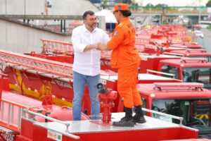 E, esse enfrentamento teve o investimento de R$ 25 milhões, composto por R$ 21,5 milhões do Ministério da Justiça e Segurança Pública (MJSP) e R$ 3,5 milhões do próprio governo do Estado. Dessa forma, cada município contemplado receberá uma viatura Auto Bomba Florestal, capaz de operar em áreas de mata, estradas vicinais e terrenos irregulares, além de kits completos de combate a incêndios – de roupas de proteção a motosserras e lanternas. Manaus também será beneficiada com mais uma viatura especializada, além de seis pick-ups e uma ambulância.
