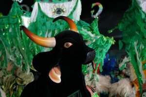 O boi-bumbá Brilhante, do bairro Compensa, zona oeste, emocionou o público ao entrar com o tema “Terra-Folclore”, enaltecendo a ligação entre o sagrado, a cultura popular e a resistência.