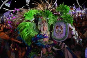 A apresentação da agremiação lilás e branca foi marcada por estruturas alegóricas gigantes, com movimentos, cores vibrantes e recursos tecnológicos, como leds e hologramas, que deram vida ao espetáculo.