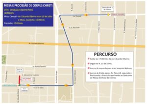 A Prefeitura de Manaus, por meio do Instituto Municipal de Mobilidade Urbana (IMMU), informa que a avenida Eduardo Ribeiro será interditada, no trecho entre as ruas 10 de Julho e Monsenhor Coutinho, das 6h às 22h desta quinta-feira (19) para a realização da “Missa de Corpus Christi” que ocorrerá às 16h30. Além da celebração, será realizada também uma procissão, no mesmo dia, que contará com interdições temporárias em outras vias do centro da cidade.