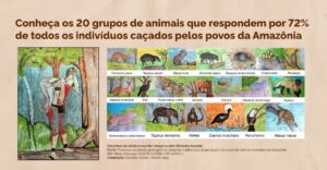O estudo aponta que na Amazônia existem mais de 2 milhões de caçadores indígenas e tradicionais, quase 20% dos povos amazônicos, populações que dependem da caça, pesca, coleta, agricultura itinerante e da criação de animais domésticos. Das 490 espécies da fauna silvestre caçada e consumida na Amazônia, 175 são mamíferos, 264 aves, 40 répteis e 11 anfíbios, que foram agrupados em 174 táxons (grupos de animais) e representam aproximadamente 10% dos 4.788 tetrápodes conhecidos na Amazônia.