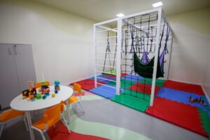 A unidade conta com 12 consultórios, sala multissensorial e espaços voltados à estimulação, projetados para proporcionar experiências com diferentes texturas e elementos naturais.
