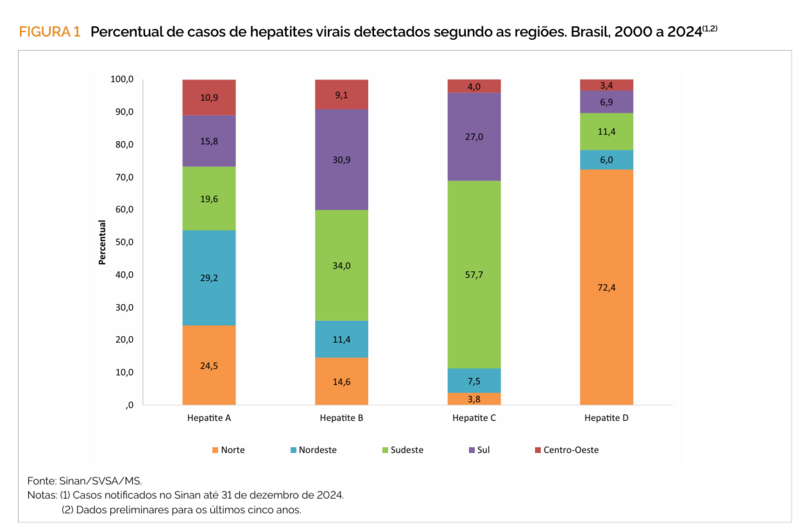 A distribuição das hepatites por região segue concentrada com as hepatites B e C nos centros urbanos, principalmente nas regiões Sul e Sudeste. A hepatite D está concentrada na Região Norte, em áreas remotas, com 72% dos casos registrados. Já a hepatite A, registrou queda global nas regiões Norte e Nordeste, onde, historicamente, teve maior incidência.