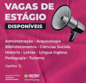 Secretaria de Estado de Cultura e Economia Criativa divulga a abertura de 37 vagas de estágio para início imediato, em oito áreas de atuação, com disponibilidade para estagiar no período da manhã, da tarde ou à noite, conforme a necessidade da área de atuação.