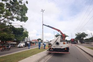 Além das equipes da Seminf, a concessionária de iluminação pública também atua no local com a manutenção e implantação de novos postes, garantindo mais segurança para motoristas e pedestres.