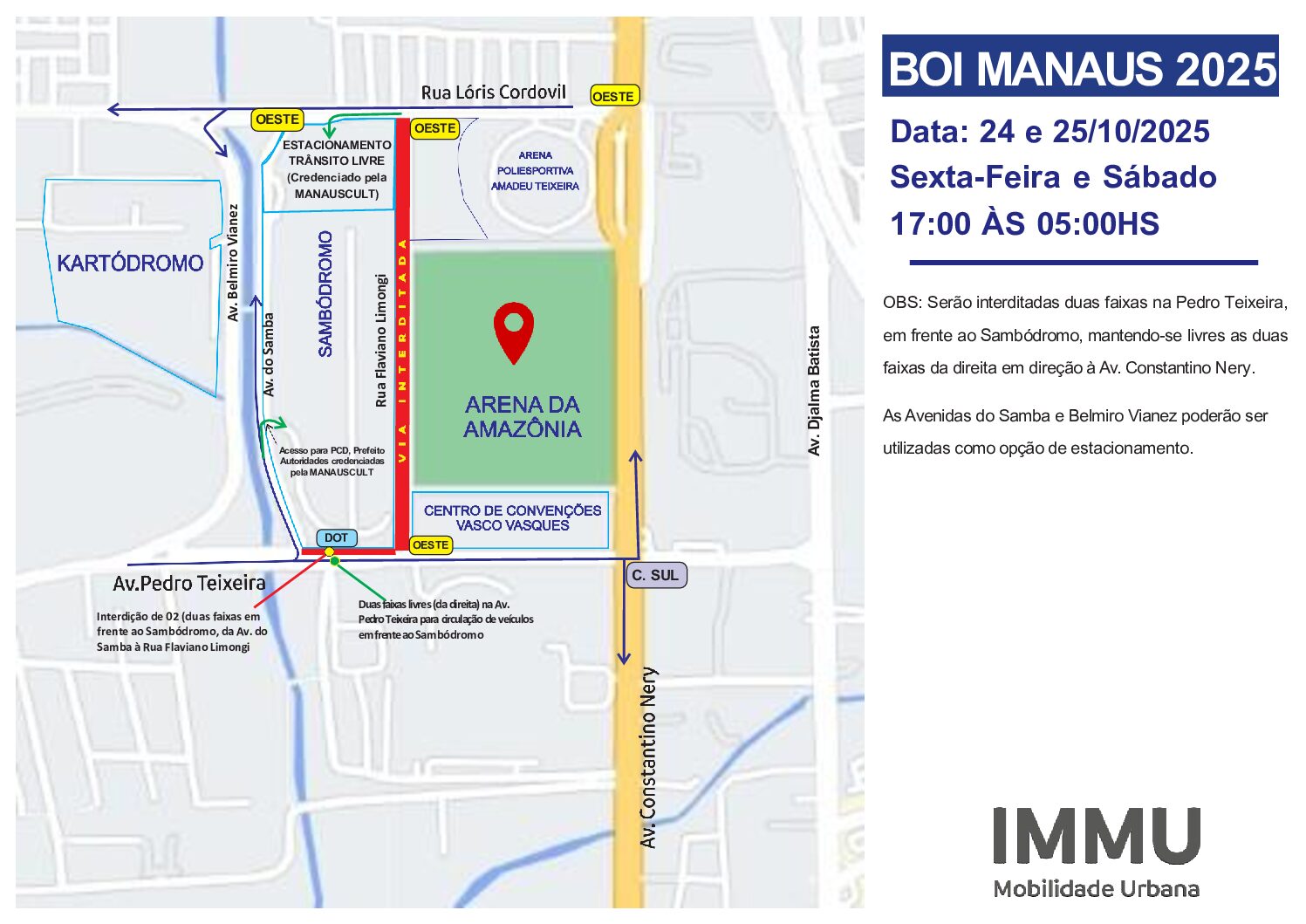 A Prefeitura de Manaus, por meio do Instituto Municipal de Mobilidade Urbana (IMMU), montou um esquema especial de trânsito para garantir segurança, fluidez e mobilidade durante os eventos comemorativos do “Aniversário de Manaus” e do tradicional “Boi Manaus 2025”. As ações começam nesta quinta-feira, (23), com o evento de aniversário realizado na alameda Alphaville Norte, e seguem na sexta-feira e sábado, dias 24 e 25/10, durante a festa do “Boi Manaus”, no entorno do centro de convenções Professor Gilberto Mestrinho, o sambódromo, na zona Centro-Oeste.