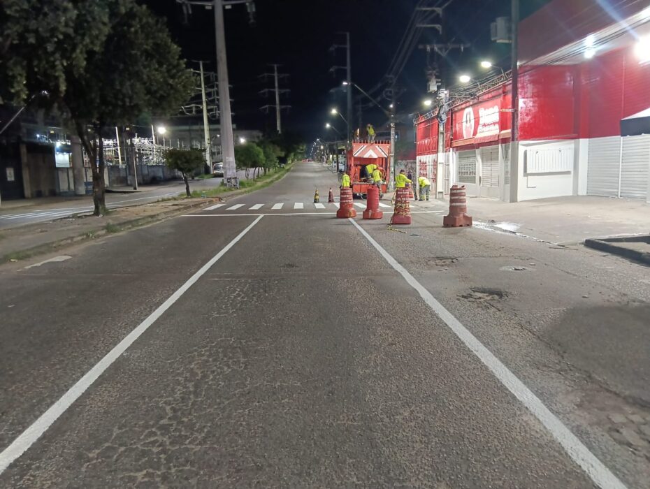 Outro ponto estratégico foi a implantação de tachões na alça de retorno da avenida Torquato Tapajós, no viaduto de Flores, medida que organiza o fluxo e reduz riscos de colisões. As ações também se estendem a cruzamentos movimentados, como na avenida Curaçao e ruas adjacentes, com reforço na sinalização horizontal e vertical.